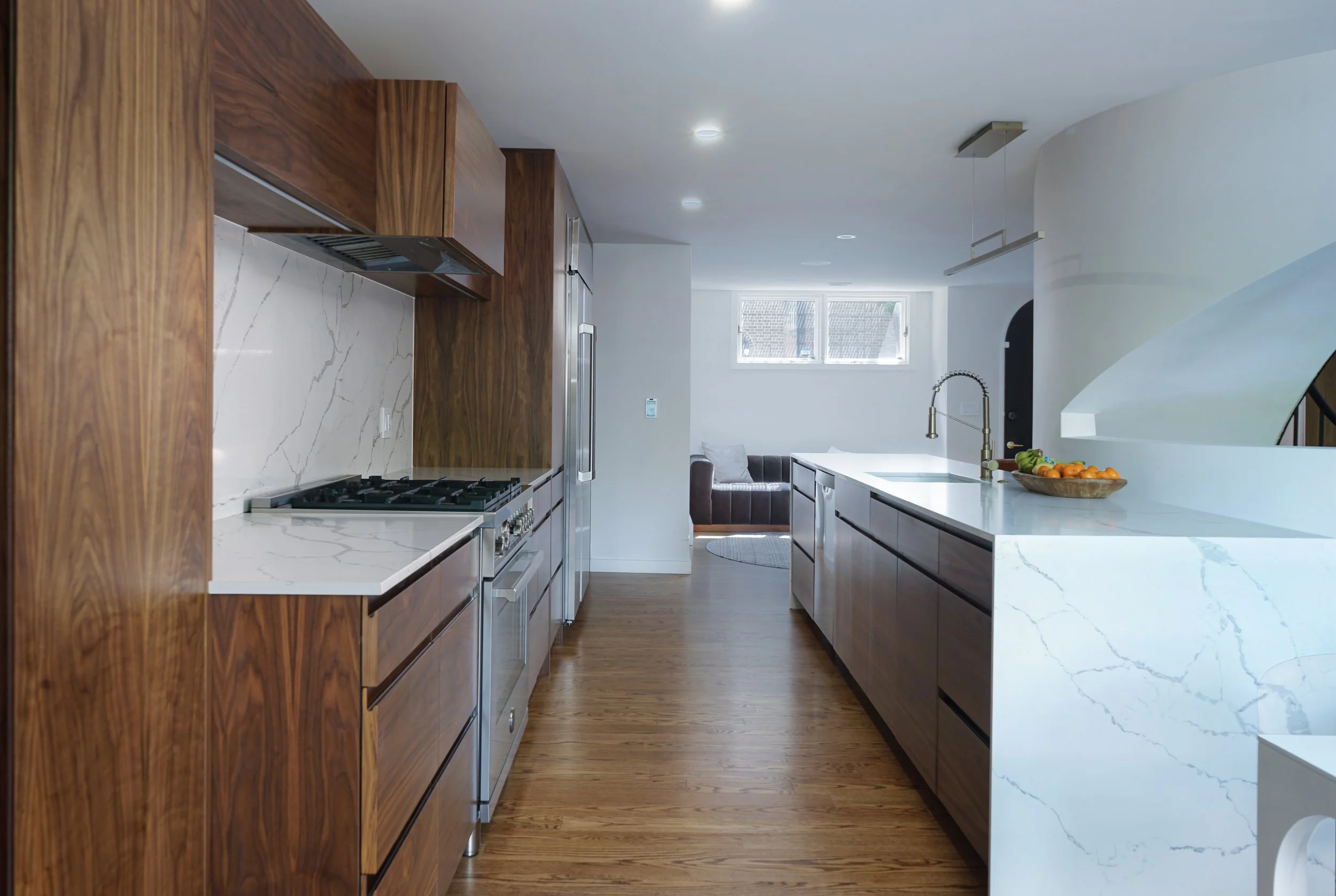 This gut renovation re-imagined the home’s layout to meet the needs of a young family. Creating the open layout of the first floor was a heavy lift, requiring structural modifications and relocation of the home’s entire mechanical systems. The final design of the first-floor stairs belongs to the homeowners, who threw it in the mix at the last minute, gaining the immediate approval of the whole team.