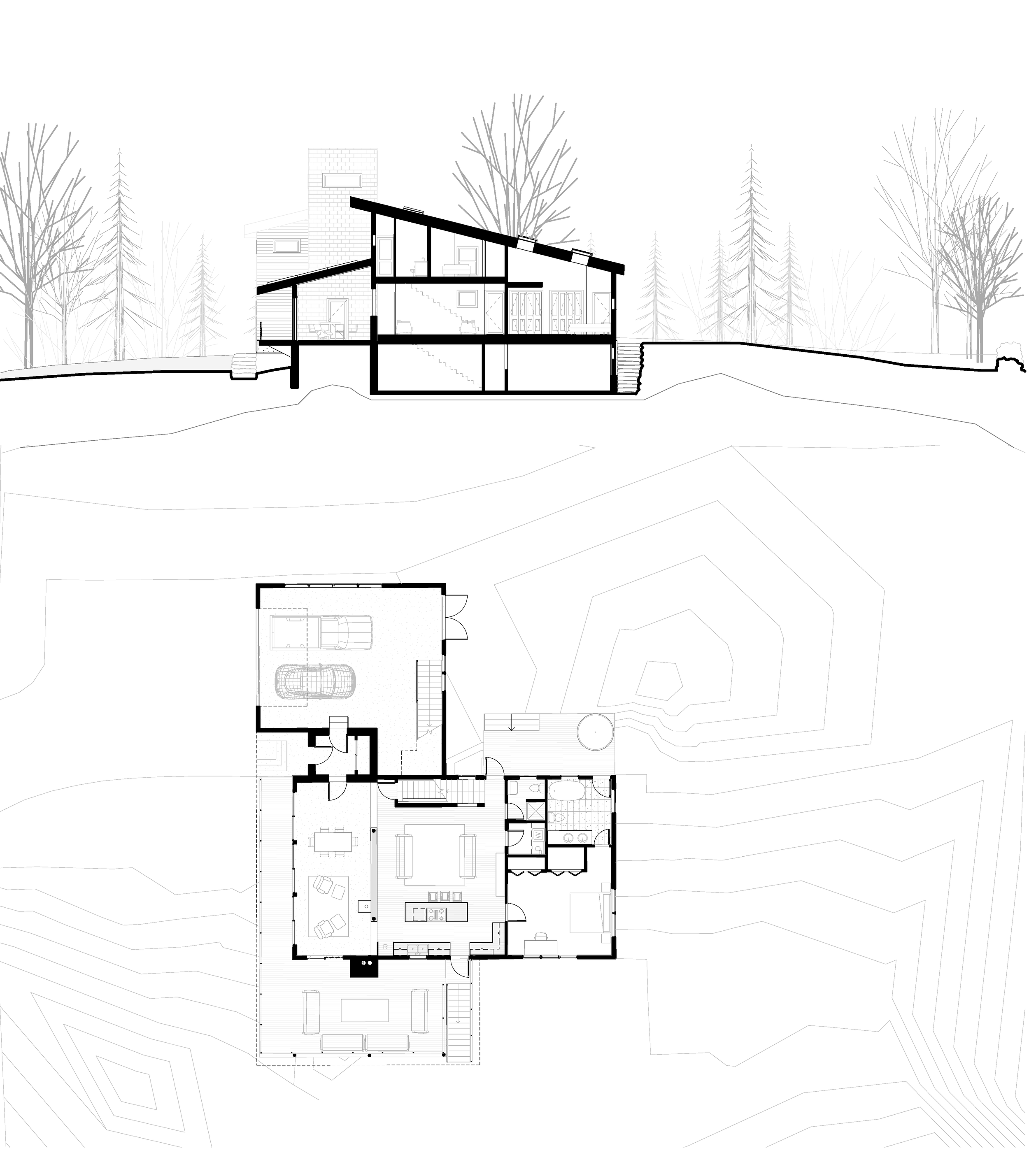 Firmly rooted in Champlain Valley’s second A-Horizon (Limestone), the home utilizes limestone quarried from the site throughout the design. Processed with a stone saw and hand tools by a young Bryan Jones, the local stone clads the aspiring and balanced vertical elements (tower, chimney, and fireplace) to anchor the building with a sense of permanence and monumentality. From these structures, the core of New England architecture (wood heat and congregation around fireplaces and cozy spaces) inspires the focal point of the residence and its communal spaces (the wood stove, outdoor fireplace, and lofted reading room in the tower - being a fireplace you can inhabit, cantilevered from the weight of the stone mast structures.