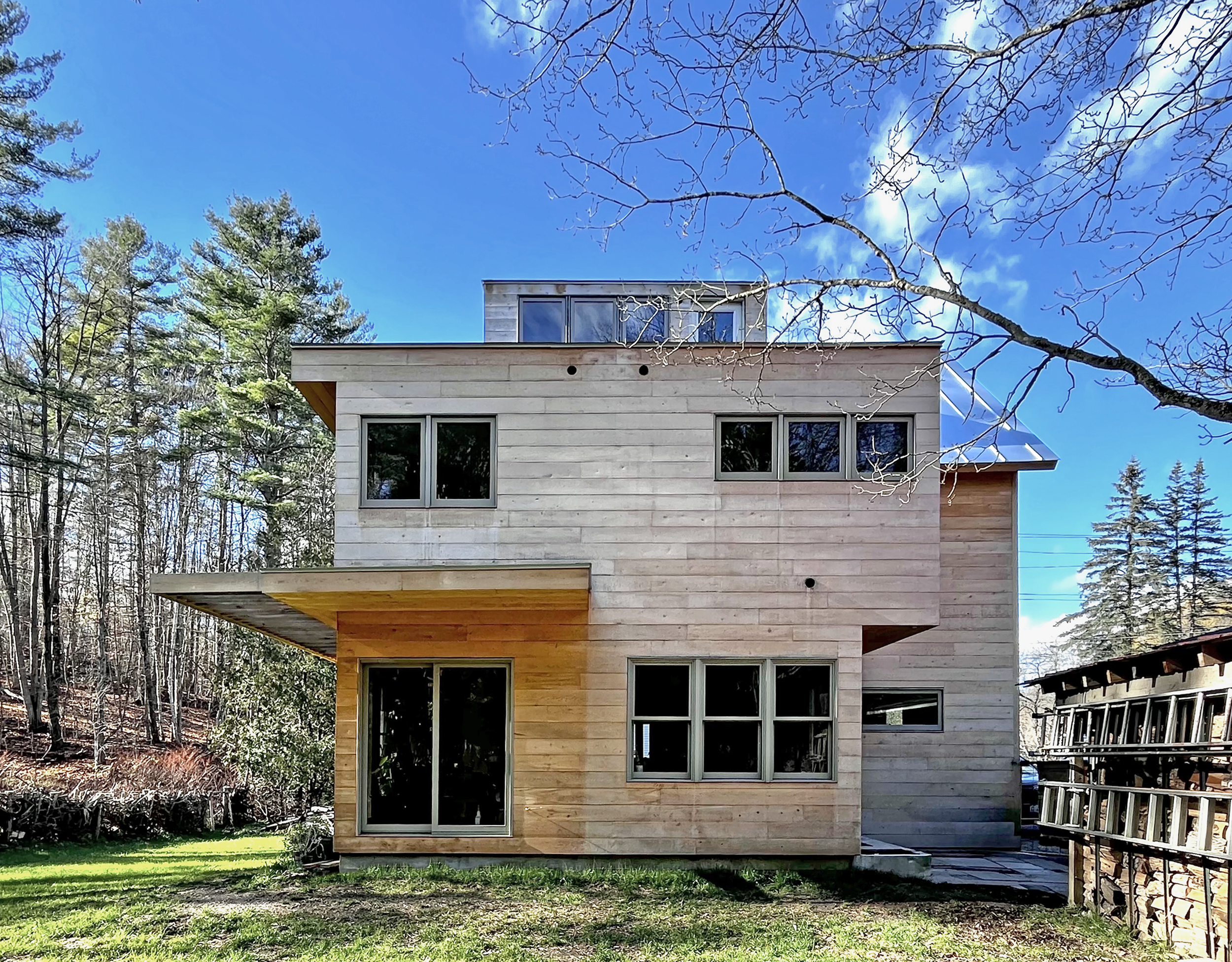 The building’s massing is consistent with the neighboring two 1850’s era factory-worker houses, each incorporating a large front porch and rear additions on the east side of the 2 ½ story New-England vernacular “gable box”. Following this “pattern of the place”, the home’s size, scale, and organization fit well in the row of original houses, with its new, locally milled northern cedar siding casting it as a type of contemporary cabin, which, with continuity in material, slowly and subtly reveals itself to be a more dramatic product of function, context, and personal vision for domestic architecture. As one moves past the screened eastern entry, a sense of novelty comes into view. Gently, the eyes are pulled around (and by) the light contemporary form of the addition, arriving at the southern facing rear yard where a more dramatic yet functional facade balances past and present in a poetic dance, its rhythmic composition, quickly transporting viewers to a place for dreaming, and, for now, a place in the universal imagination of inspired domestic architecture.