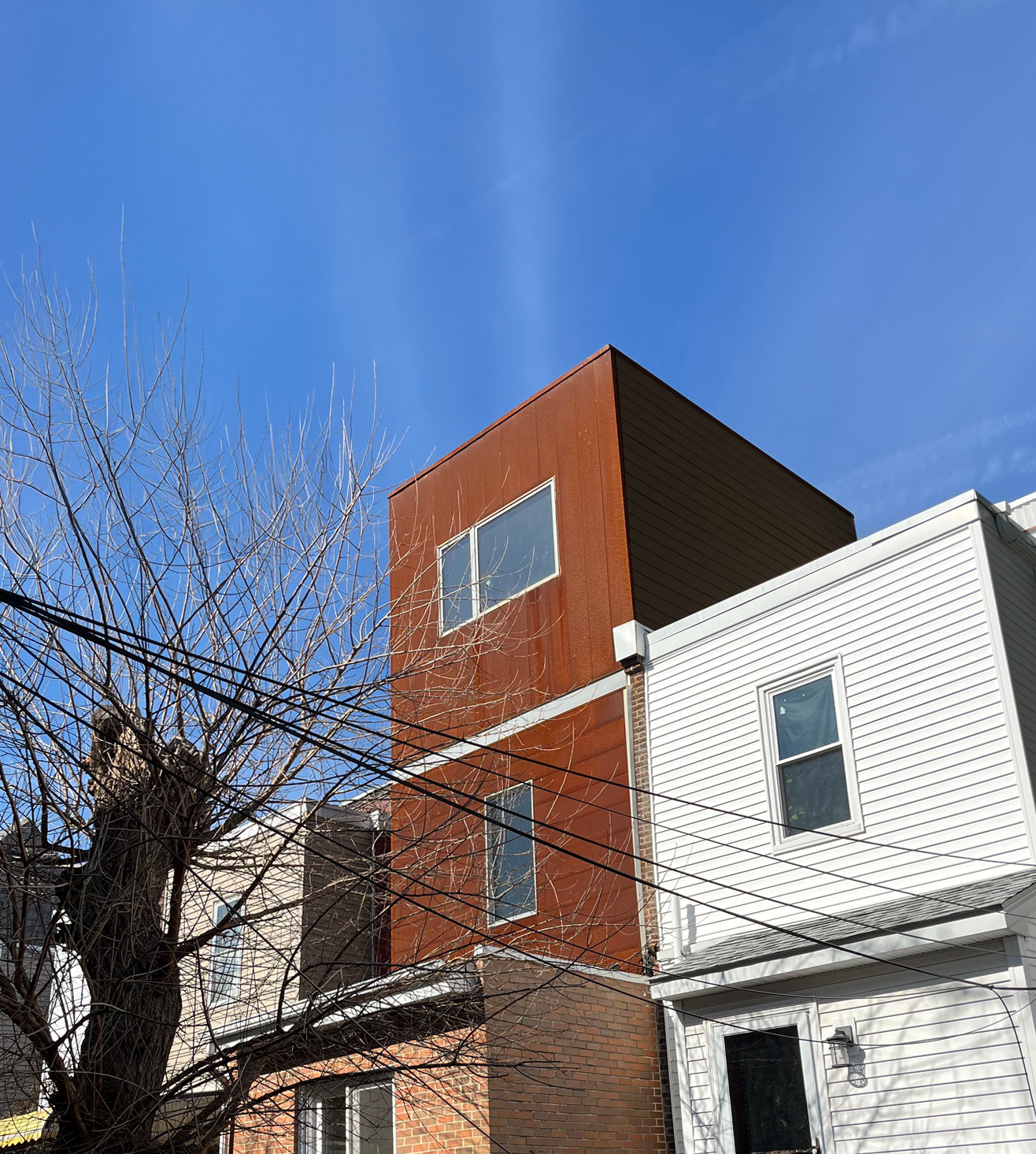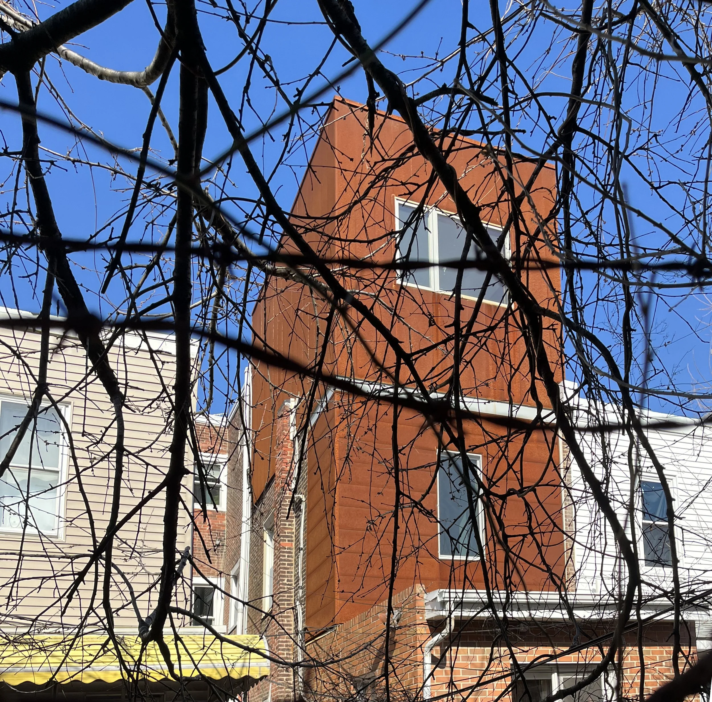 The project expands an existing rear bedroom and introduces another. Early studies considered a future green roof and roof deck, but the realized work favors simpler interior spaces wrapped in a warm Corten steel panelized skin. The material, a carbon cousin to the burnt-orange brick below, is calibrated to the proportions of the second- and third-floor additions.